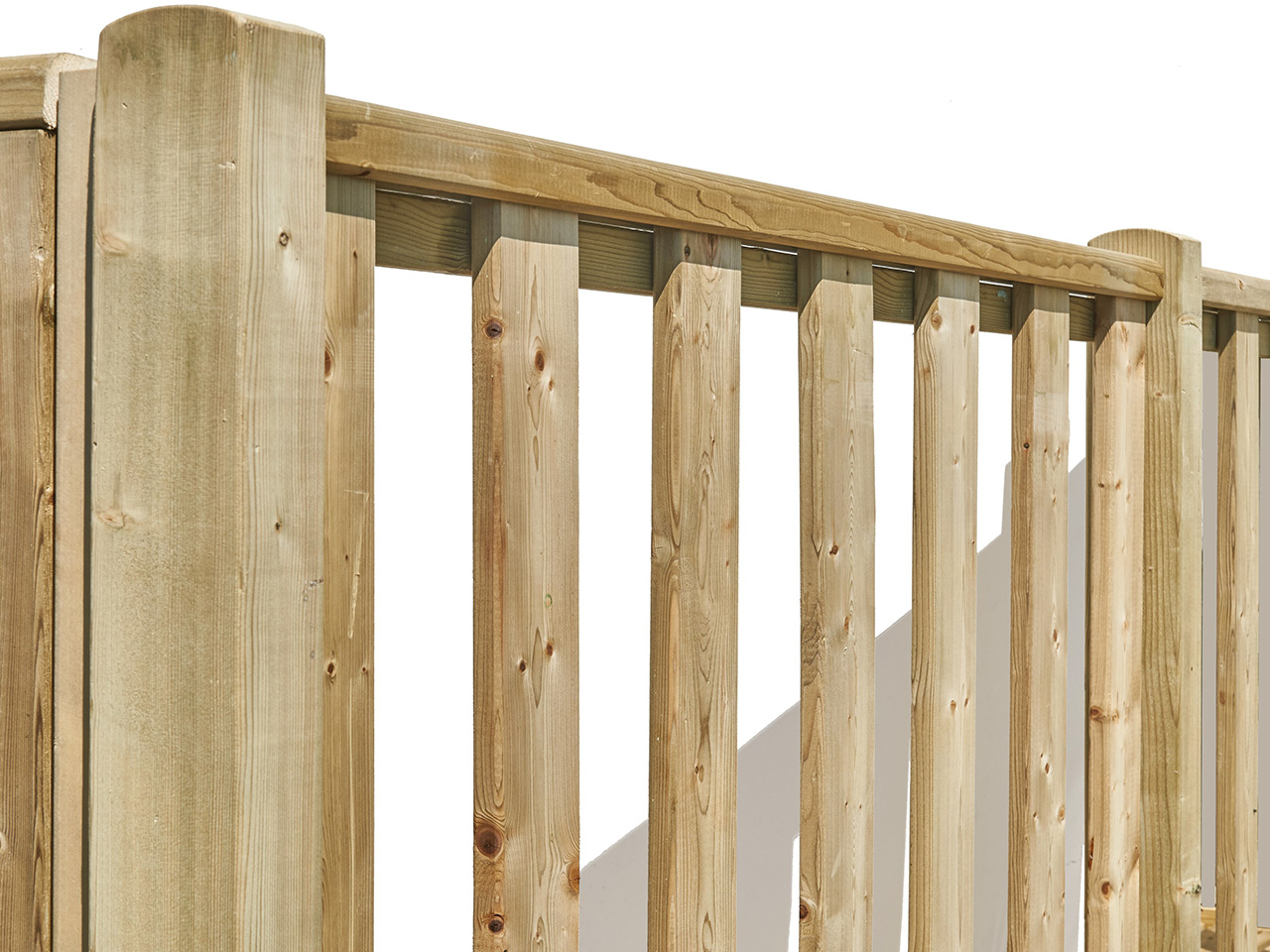 Un look classique, simple et efficace avec la rambarde à barreaux verticaux. Votre terrasse est livrée avec la rambarde Ecoluxe de série. Vous pouvez cependant décider de personnaliser votre terrasse et de choisir une rambarde Bella, Pyla ou Roma.