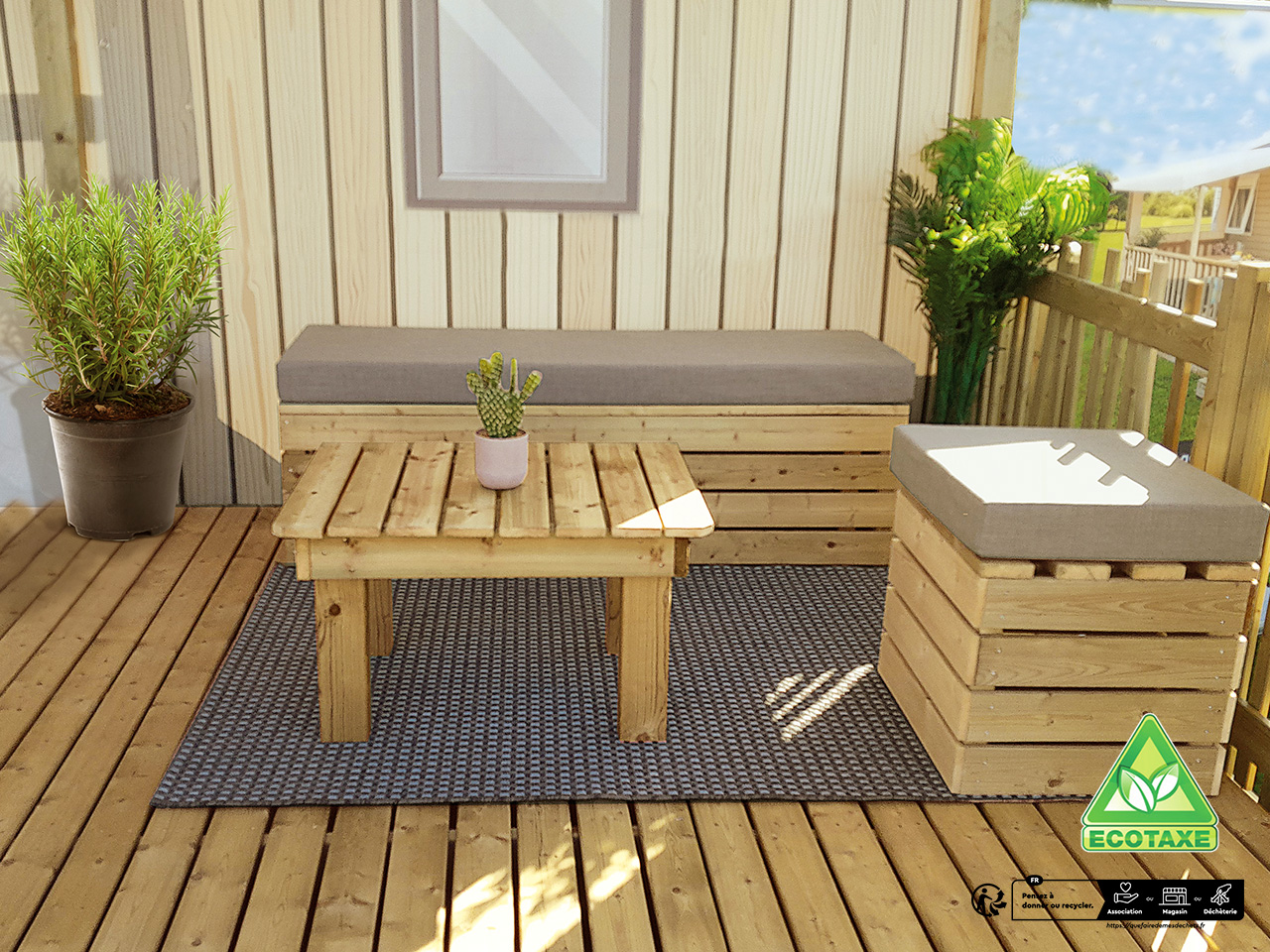 Notre collection de mobilier de salon extérieur en bois agrémente l'espace détente de la terrasse en bois de votre mobil-home. Chaque élément est à commander séparément pour composer votre salon idéal.